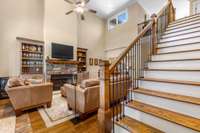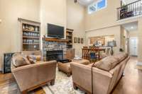 Step inside to find tall ceilings and a beautiful stone fireplace anchoring the spacious living room, which flows seamlessly into a dedicated dining area. The open layout continues with a generous kitchen featuring a buffet window overlooking the living room—ideal for entertaining or staying connected while cooking.